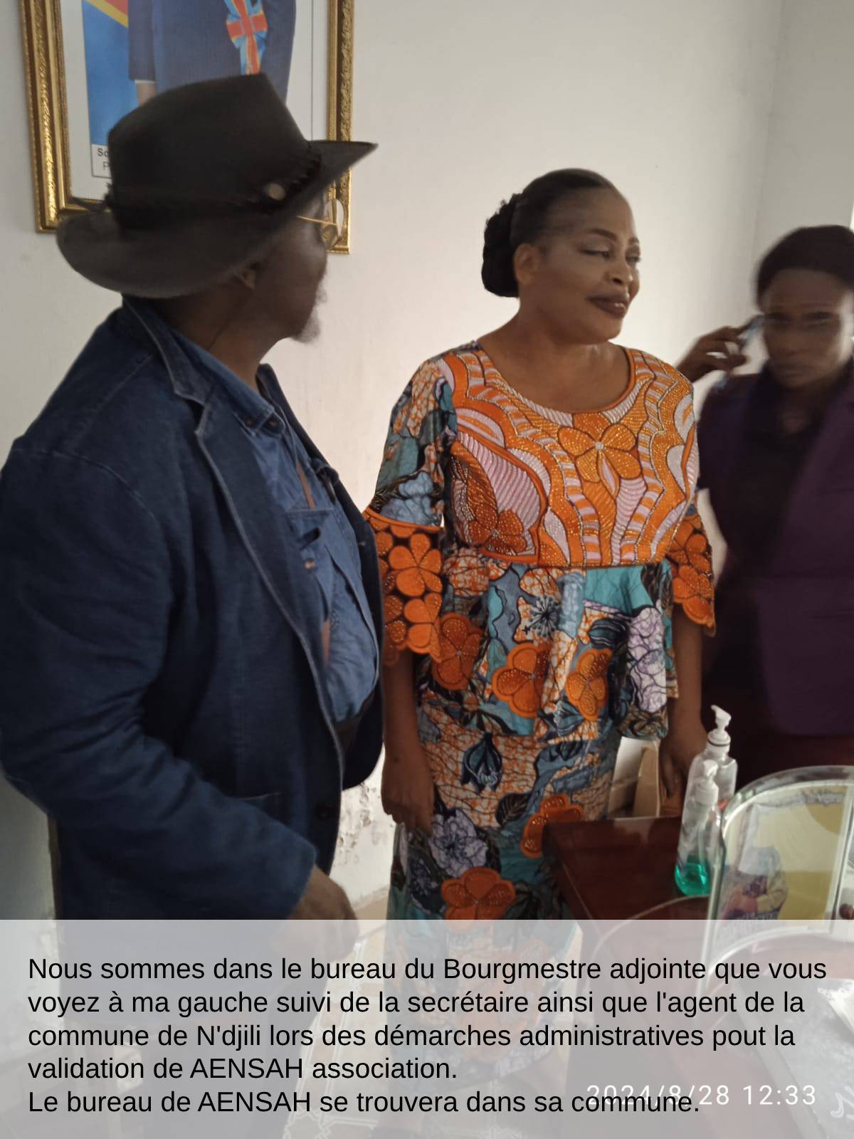 Nous sommes dans le bureau du Bourgmestre adjointe que vous voyez à ma gauche suivi de la secrétaire ainsi que l'agent de la commune de N'djili lors des démarches administratives pout la validation de AENSAH association. Le bureau de AENSAH se trouvera dans sa commune.