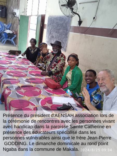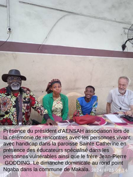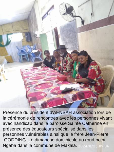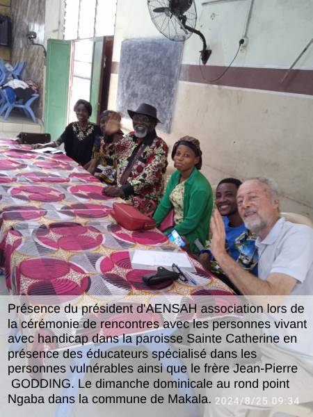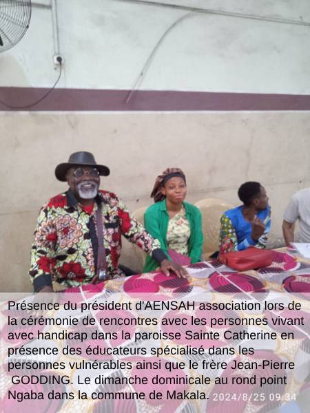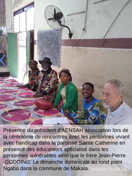 Présence du président d'AENSAH association lors de la cérémonie de rencontres avec les personnes vivant avec handicap dans la paroisse Sainte Catherine en présence des éducateurs spécialisé dans les personnes vulnérables ainsi que le frère Jean-Pierre GODDING. Le dimanche dominicale au rond point Ngaba dans la commune de Makala.