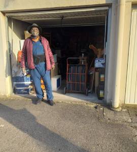 Président AENSAH devant son garage où il garde les objets de l'association