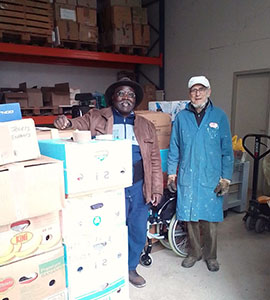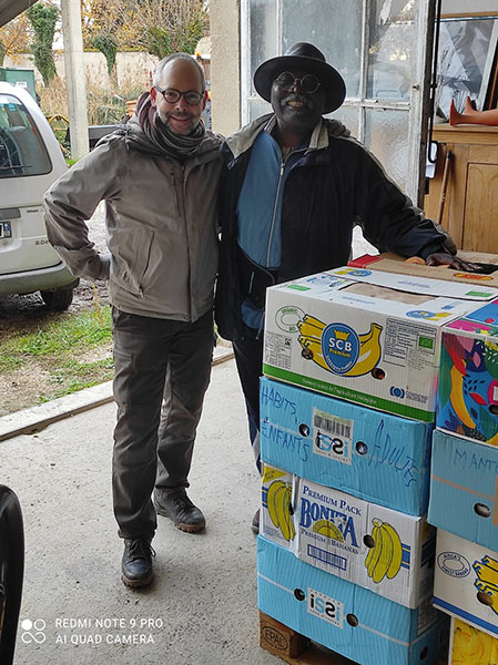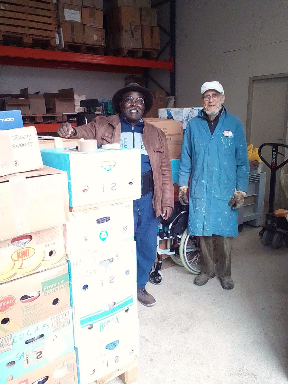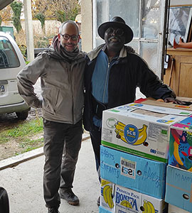 président d'aensah et frère jacques du ccn dans le depôt de l'abbaye faisant un don en nature